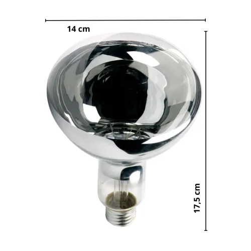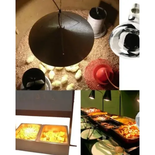 Com emissão concentrada de calor e 90% da energia convertida em aquecimento, proporciona secagem rápida, aquecimento de animais, pessoas e alimentos, além de aplicações industriais como secar, assar, carbonizar e derreter materiais. Seu soquete E27 permite instalação fácil em equipamentos adequados.